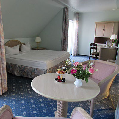 Unsere Doppelzimmer verfügen auf ca. 25m² über ein Kingsizebett mit separaten Matratzen, einer Sitzgelegenheit und einem Schreibtisch. Der Balkon mit Sitzgelegenheit ist wunderbar zum Genießen lauer Sommerabende.
