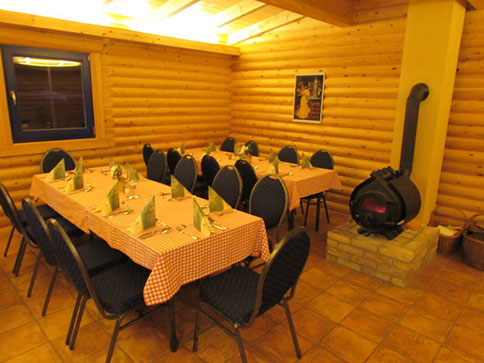 Unser Haus am See ist mit seinen 32m² und integriertem Kamin ein ganz außergewöhnlicher Tagungsraum im rustikalen Blockhaus-Stil.