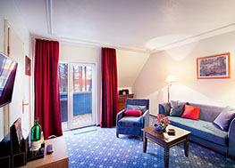 Mit kombiniertem Wohn- und Schlafbereich, einer separaten Sitzecke und Schreibtisch bieten Ihnen unsere großzügigen Apartments extra viel Platz während des Aufenthaltes. Gelegen im Dachgeschoss unseres Hauses verfügen Sie über zwei Balkone.